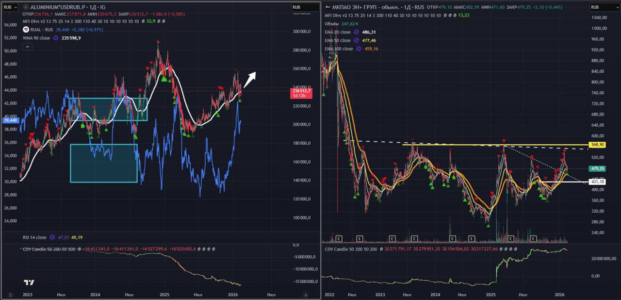 Будьте готовы, можем по ним делать спекулятивные сделки. Алюминий в рублях уже снова растет, скоро перехай (левый график)