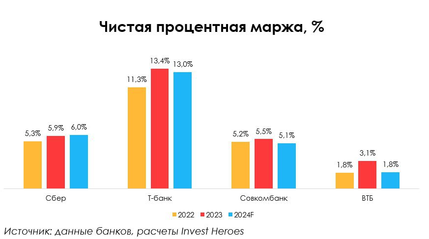 На 2024 г. мы ожидаем, что большинство банков покажет прирост по чистым процентным доходам по причине сильного потребителя в экономике и высокой деловой активности предприятий (это стимулировало активно брать кредиты). При этом, на фоне роста ключевой ставки и соревнований банков по привлечению депозитных клиентов (высокими ставками) чистая процентная маржа умеренно снизиться. Мы ожидаем, что чистая процентная маржа Т-банка составит 13.0% (-0.3 п.п. г/г), у Совкомбанка составит 5.1% (-0.4 п.п. г/г), у ВТБ (как наиболее восприимчивого игрока к стоимости фондирования) маржа снизиться до 1.8% (-1.3 п.п. г/г), а Сбер может показать небольшой рост до 5.98% (+0.08 п.п. г/г).