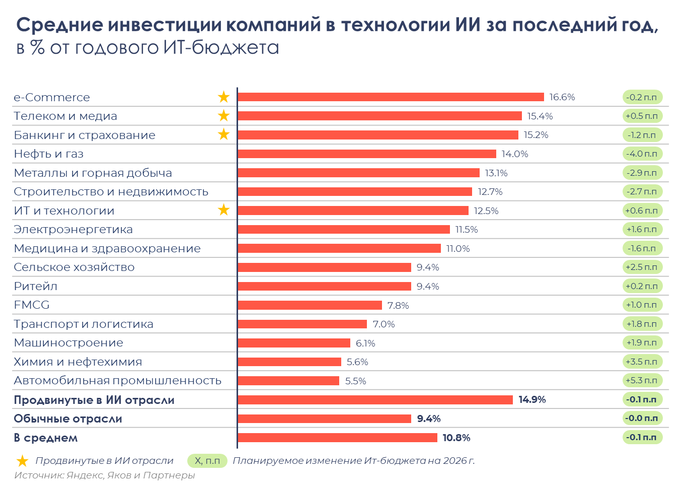 • Компании из передовых отраслей за последний год направили на развитие решений на базе ИИ от 13 до 17% годового ИТ-бюджета. В целом по рынку этот показатель ниже — порядка 11%. Больше всего бизнесы инвестируют в генеративный ИИ, и в следующем году планируют увеличить эту статью расходов на 25%.
