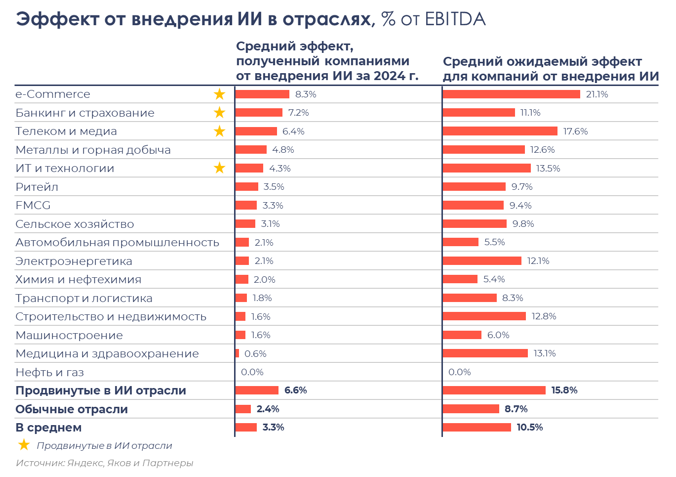 В отраслях, где системно применяют ИИ, экономический эффект от его внедрения оценивают в размере до 8% EBITDA компании. ИИ позволяет сократить затраты и получить новые источники выручки за счет продуктовых инноваций и трансформации бизнес-моделей.