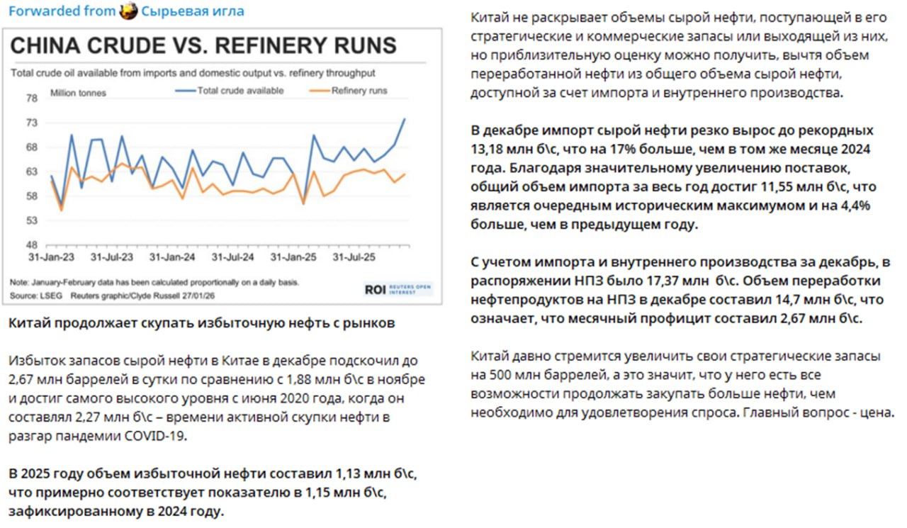 Эти данные - ещё один аргумент в пользу того, что атака на Иран - логична и будет (или как вариант будет морская блокада танкеров, идущих в Китай именно из Ирана). И что одна из целей США с Россией - это развязать наши поставки нефти на рынок Китая по дисконтной цене - пускай лучше на мировой рынок.