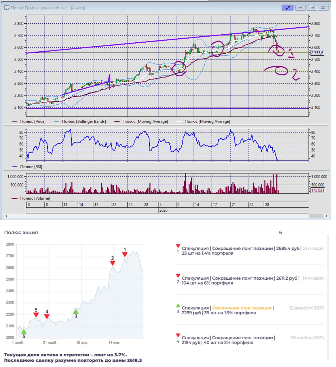 Поэтому в точке 1 на рисунке мы купим 1-1.5%, а в точке 2 - будем обирать агрессивно, порядка 5% докупки, чтобы долю Полюса вывести в 10-12%. Сегодня первая маленькая покупка.